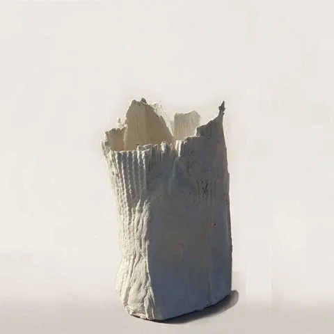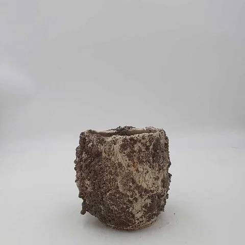 Foggiatura a tornio con argilla Gres bianca. Sovrapposizione di rocce dolomitiche di raccolta. Cottura elettrica.